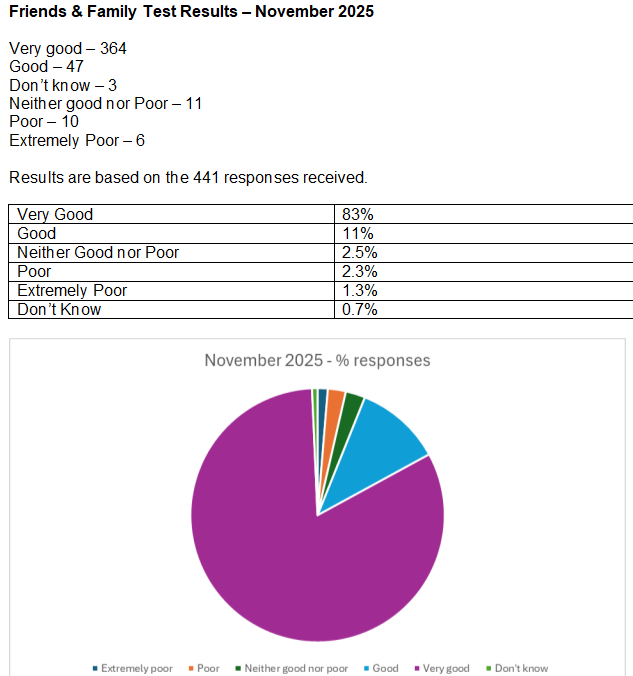The Friends and Family Test (FFT) is an important feedback tool that supports the fundamental principle that people who use NHS services should have the opportunity to provide feedback on their experience. Listening to the views of patients and staff helps identify what is working well, what can be improved and how.